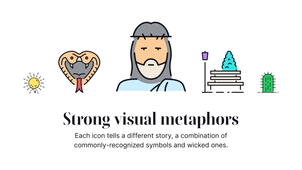 Each icon tells a different story, a combination of commonly-recognized symbols and wicked ones.